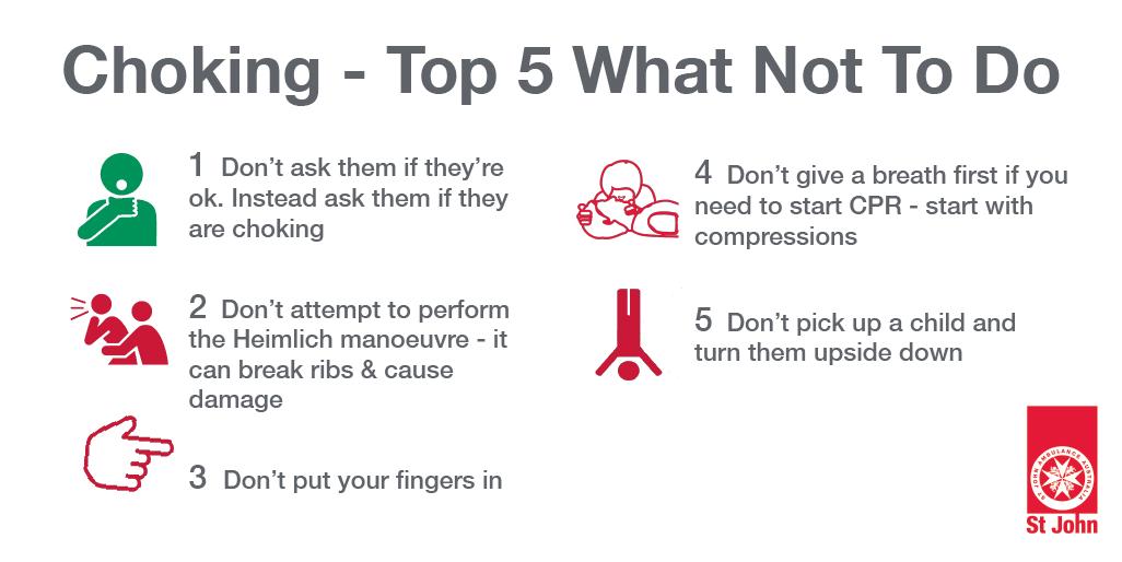 2. Don’t attempt to perform the Heimlich manoeuvre (i.e. a big thrust to the abdominal area) as it can break ribs and damage internal organs