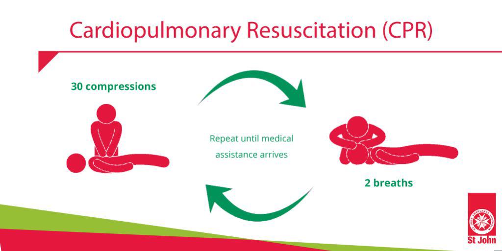 - Continue compressions and breaths in a ratio of 30:2 until medical assistance arrives