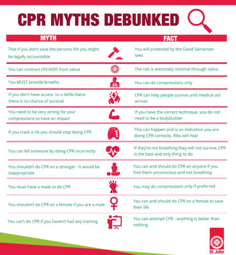There are many reasons why people may hesitate to provide CPR in the case of a health emergency. Some common reasons that may come to mind, but are completely untrue include: