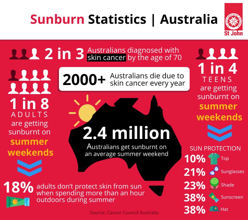 According to Cancer Council Australia on the average summer weekend in Australia, 1 in 8 adults and 1 in 5 teenagers suffer from sunburn. Compared to four years ago, approximately 430,000 more Australian adults are getting sunburnt on the weekend which equates to almost 2.4 million Australians suffering each weekend.