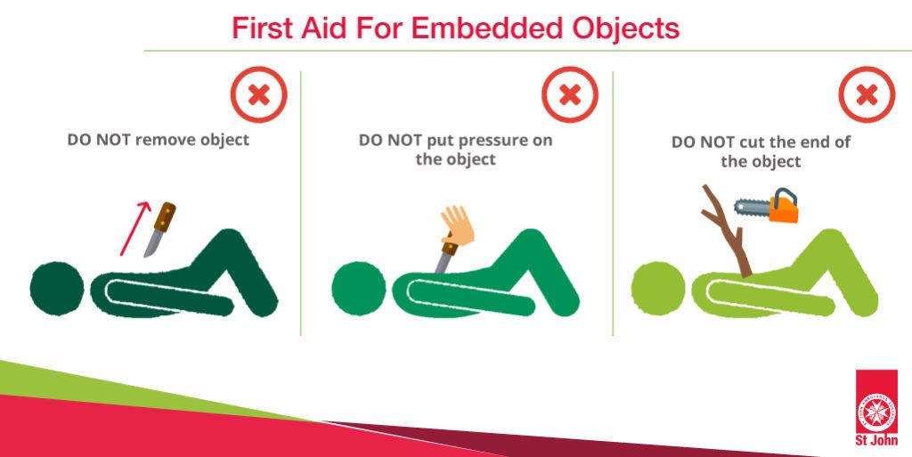 - DO NOT remove the embedded object as it may be preventing significant blood loss. The removal of the object could also cause major structural and nerve damage; it must always be removed by a professional